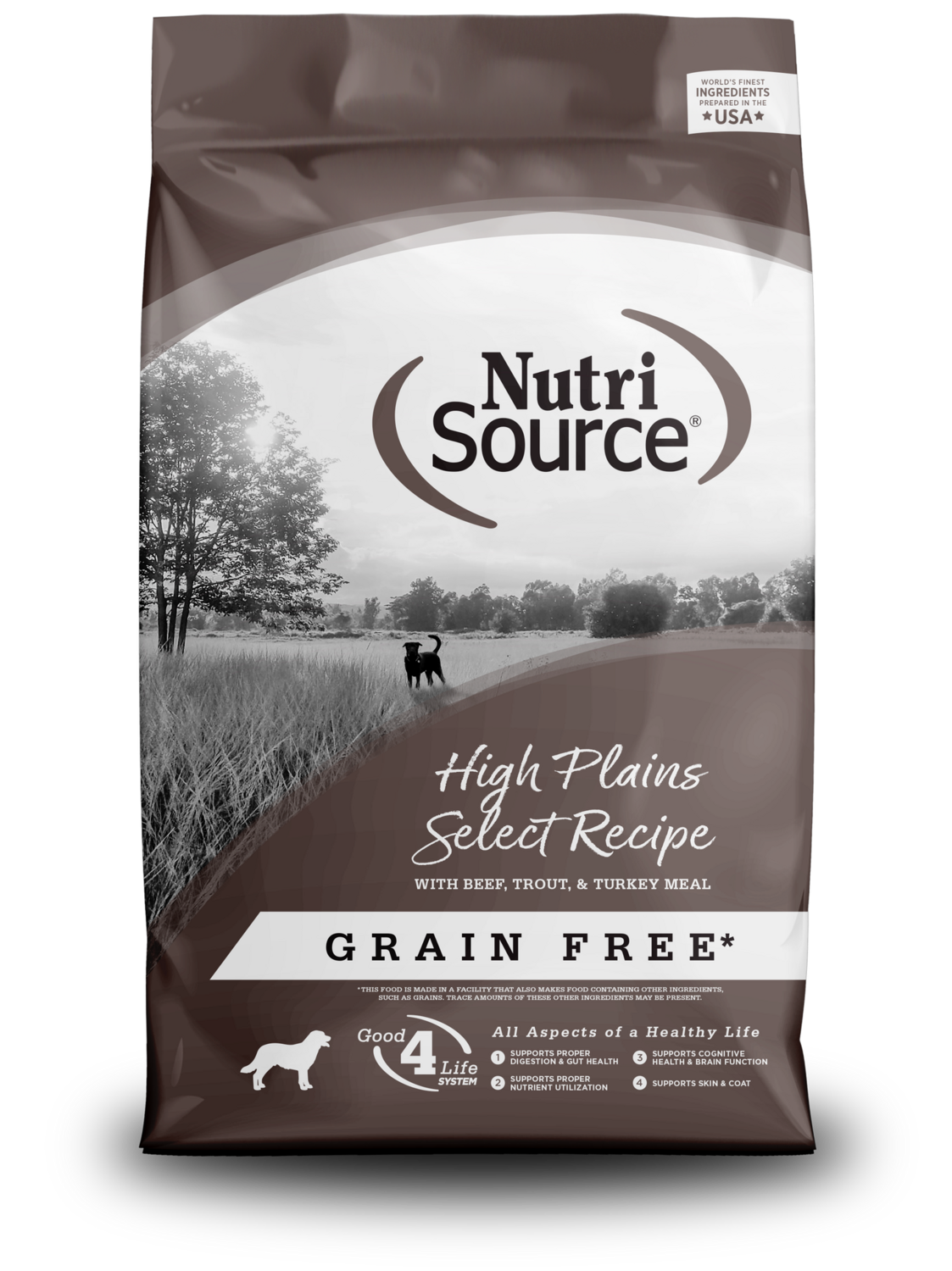NutriSource® High Plains Select Recipe Grain Free Dog Food is formulated to meet the nutritional levels established by the Association of American Feed Control Officials (AAFCO) Dog Food Nutrient Profiles for all life stages except for growth of large size dogs (70 lbs. or more as an adult).